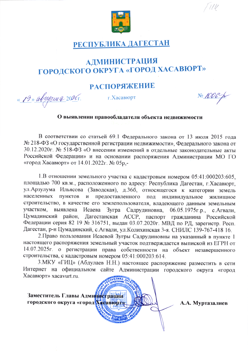 Распоряжение от 19 августа 2025 г. № 1006-р О выявлении правообладателя объекта недвижимости