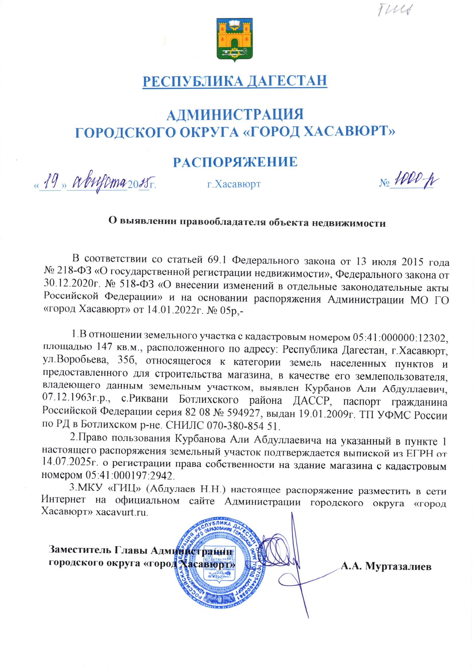 Распоряжение от 19 августа 2025 г. № 1000-р О выявлении правообладателя объекта недвижимости
