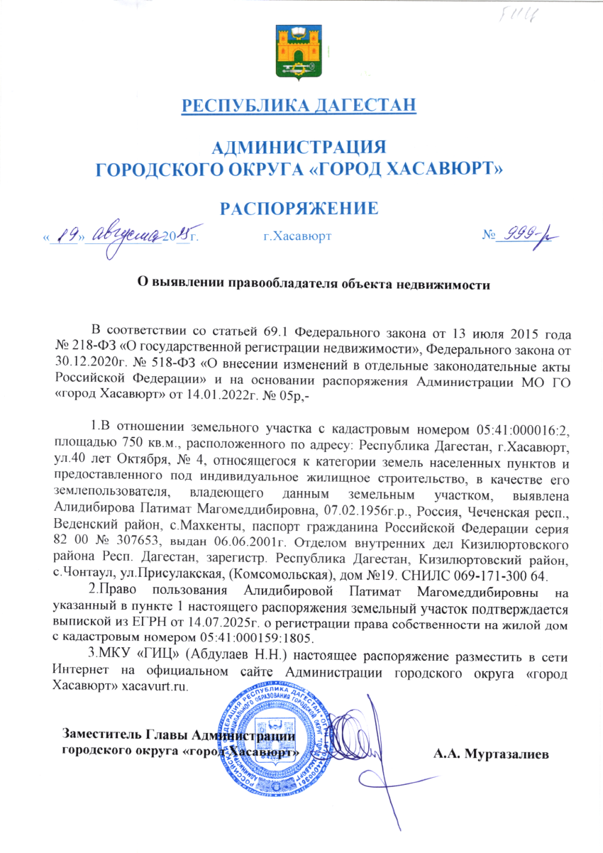 Распоряжение от 19 августа 2025 г. № 999-р О выявлении правообладателя объекта недвижимости