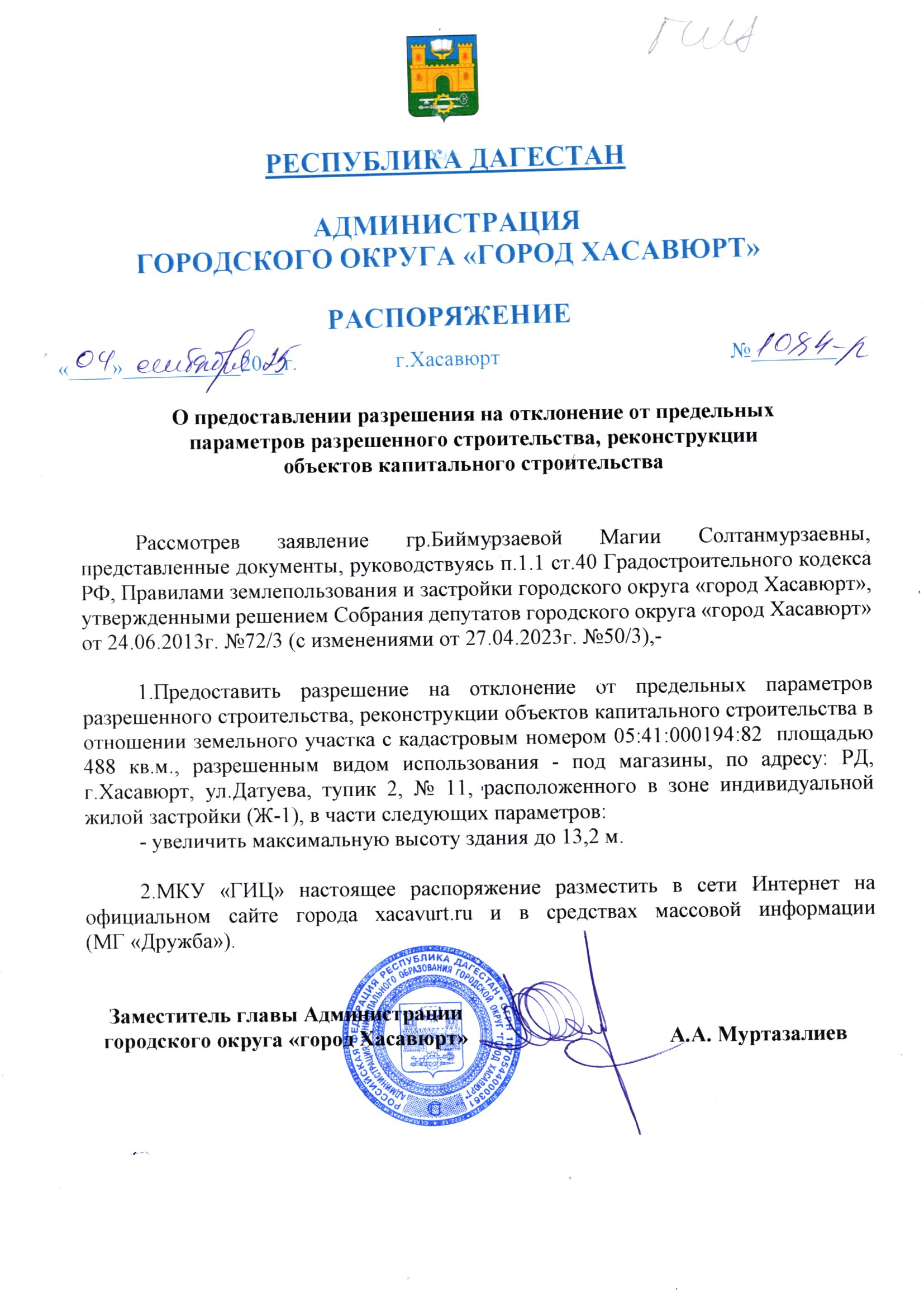 Распоряжение от 4 сентября 2025 г. № 1084-р О представлении разрешения на отклонение от предельных параметров разрешенного строительства, реконструкции объектов капитального строительства