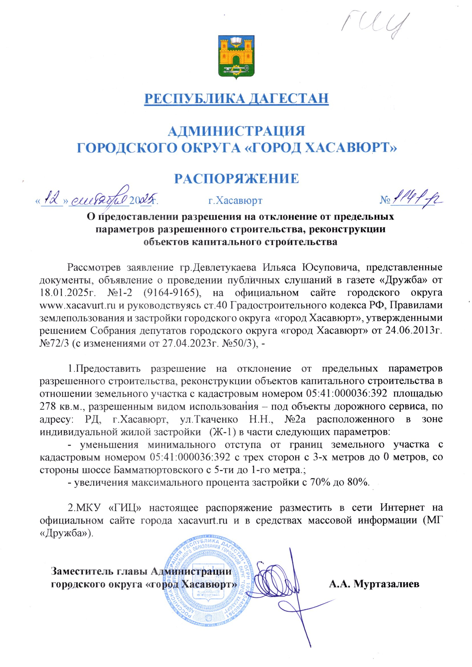 Распоряжение от 12 сентября 2025 г. № 1141-р О предоставлении разрешения на отклонение от предельных параметров разрешенного строительства, реконструкции объектов капитального строительства