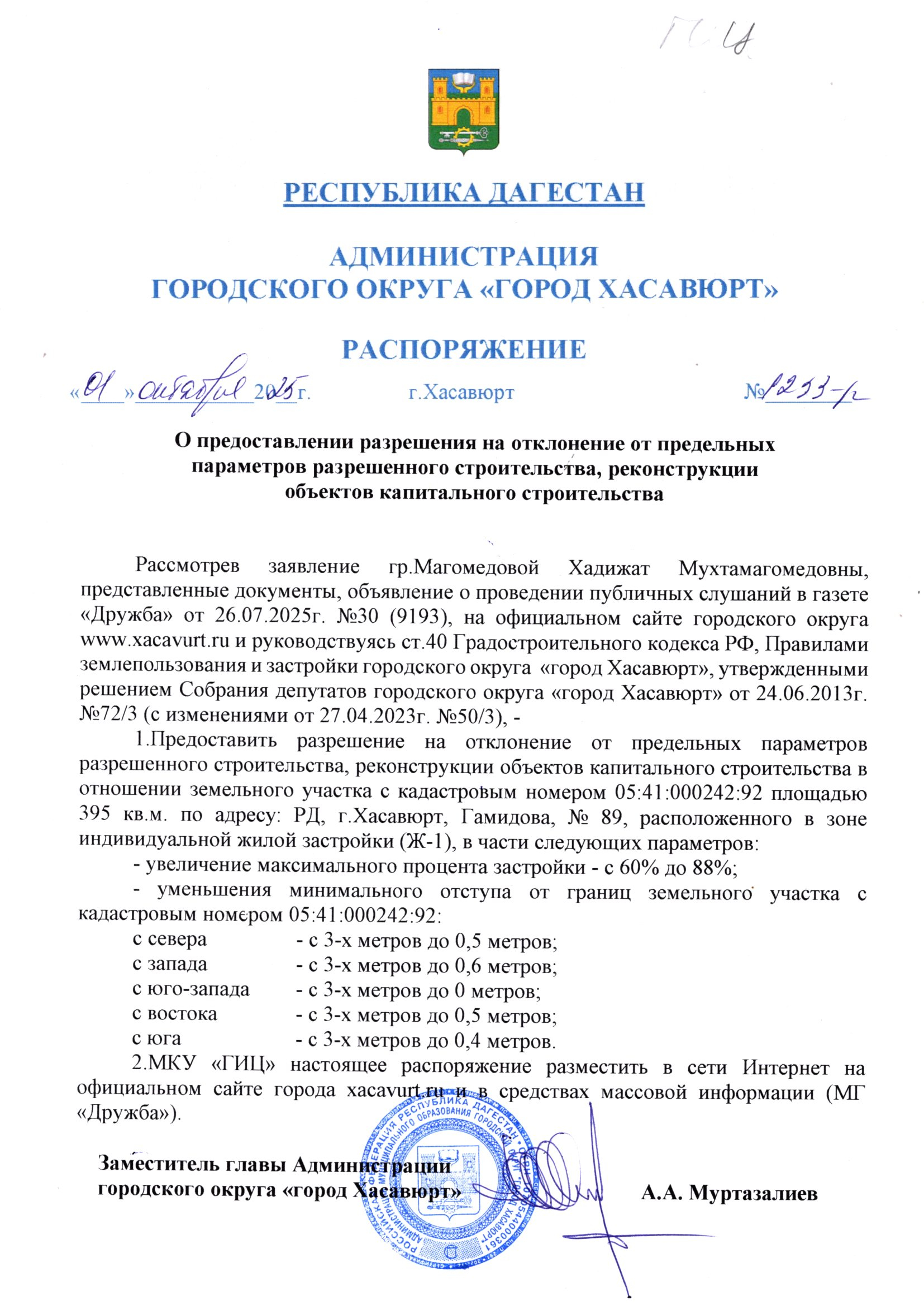 Распоряжение от 1 октября 2025 г. № 1233-р О предоставлении разрешения на отклонение от предельных параметров разрешенного строительства, реконструкции объектов капитального строительства