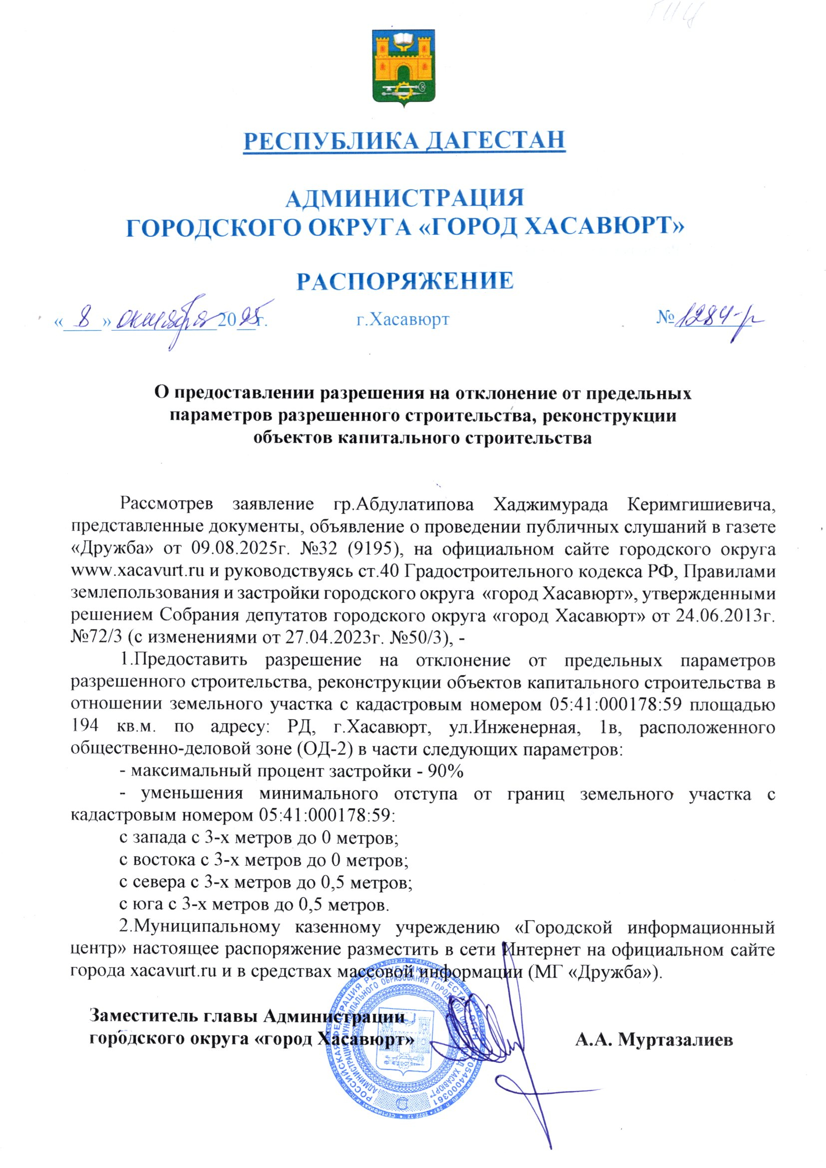 Распоряжение от 8 октября 2025 г. 1284-р О предоставлении разрешения на отклонение от предельных параметров разрешенного строительства, реконструкции объектов капитального строительства