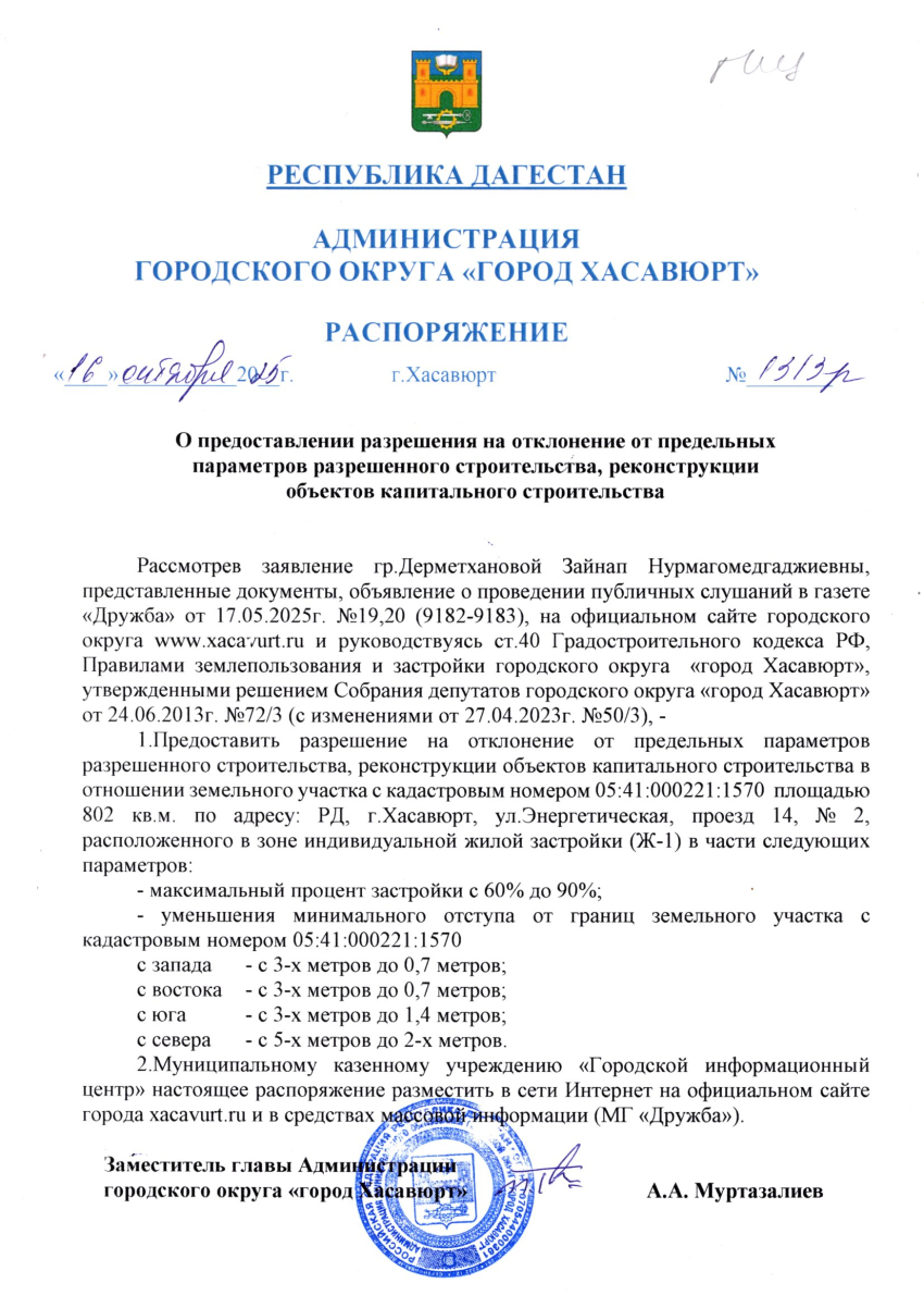 Распоряжение от 16 октября 2025 г. № 1313-р О предоставлении разрешения на отклонение от предельных параметров разрешенного строительства, реконструкции объектов капитального строительства