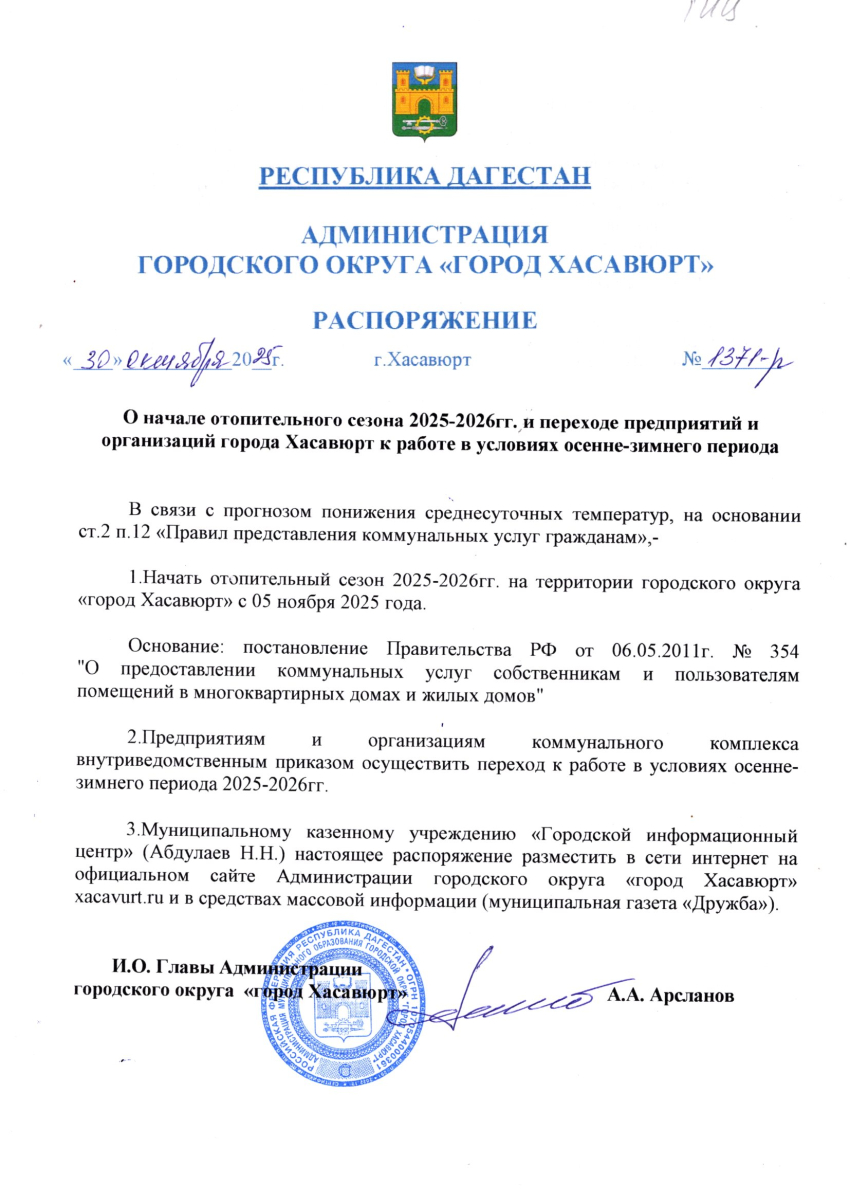 Распоряжение от 30 октября 2025 г. № 1371-р О начале отопительного сезона 2025-2026гг. и переходе предприятий и организаций города Хасавюрт к работе в условиях осенне-зимнего периода