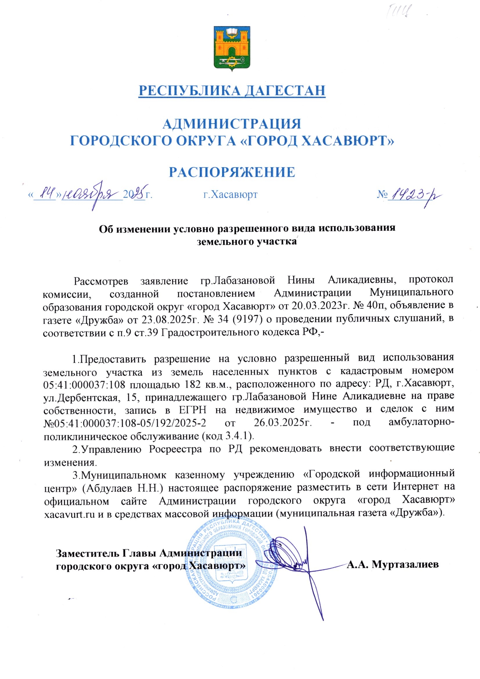 Распоряжение от 14 ноября 2025 г. № 1423-р Об изменении условно разрешенного вида использования земельного участка