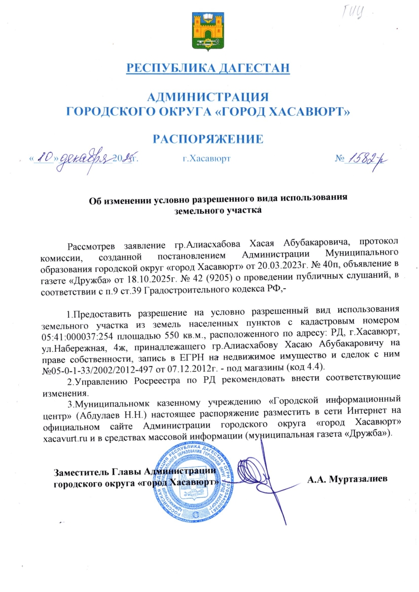Распоряжение от 10 декабря 2025 г. № 1582-р Об изменении условно разрешенного вида использования земельного участка