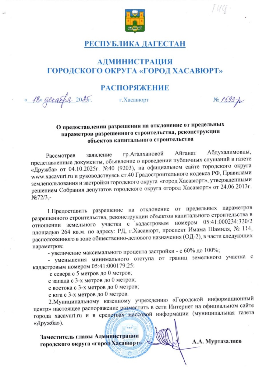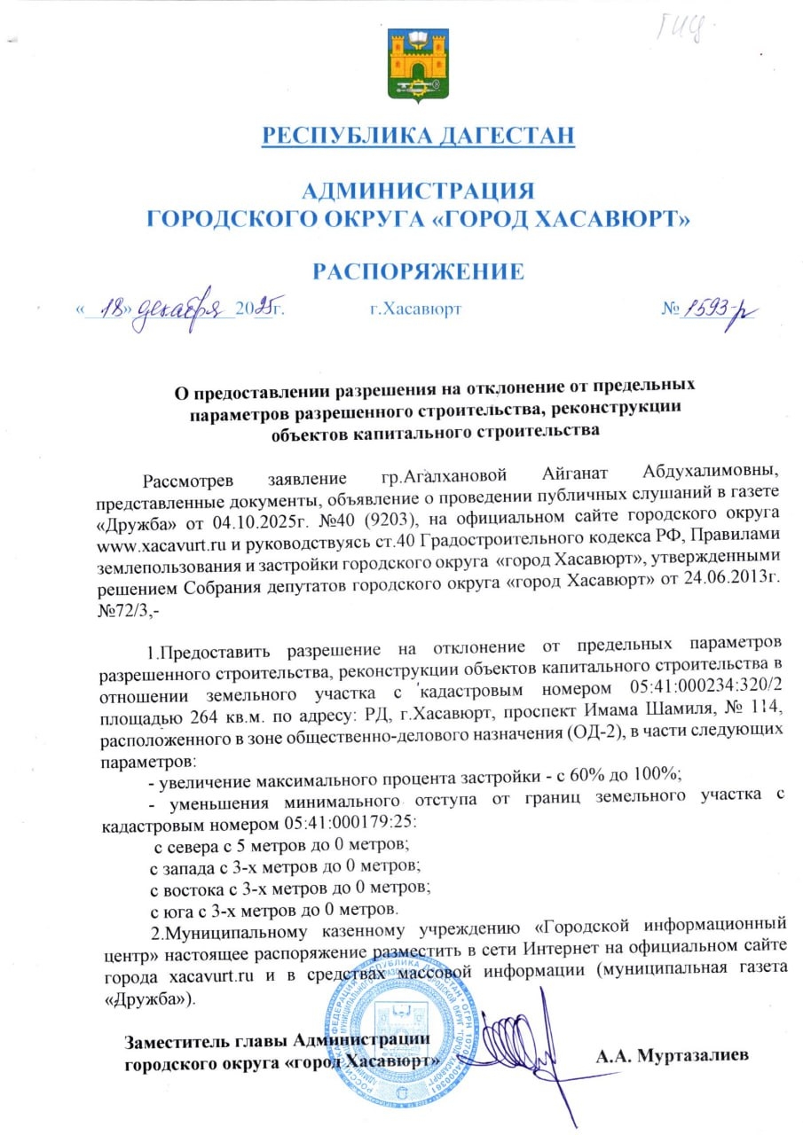 Распоряжение от 18 декабря 2025 г. № 1593-р О предоставлении разрешения на отклонение от предельных параметров разрешенного строительства, реконструкции объектов капитального строительства