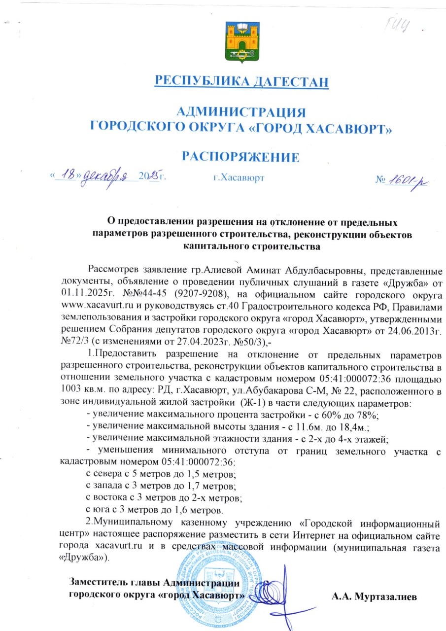 Распоряжение от 18 декабря 2025 г. № 1601-р О предоставлении разрешения на отклонение от предельных параметров разрешенного строительства, реконструкции объектов капитального строительства