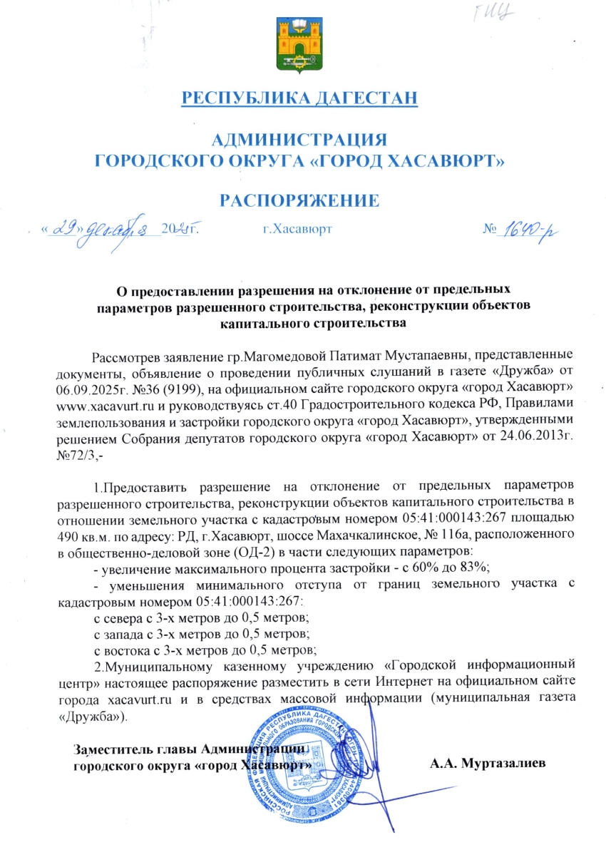 Распоряжение от 29 декабря 2025 г. № 1640-р О предоставлении разрешения на отклонение от предельных параметров разрешенного строительства, реконструкции объектов капитального строительства