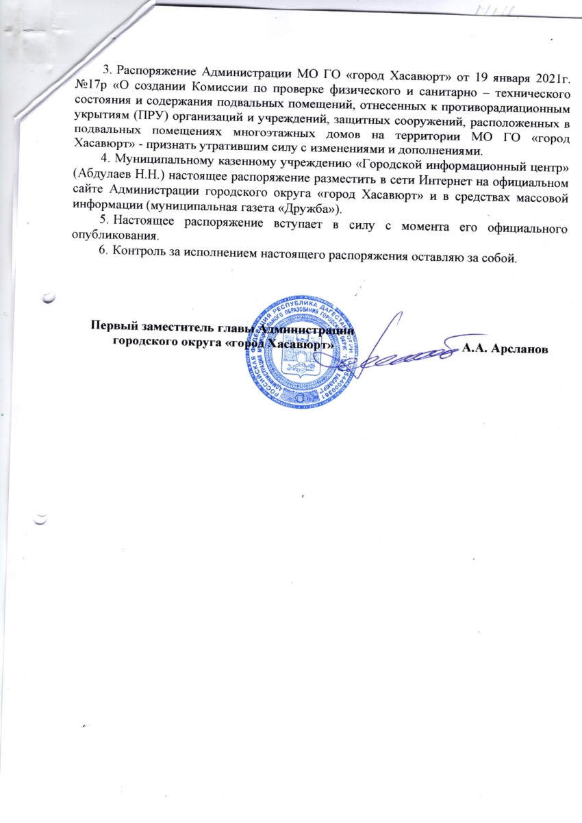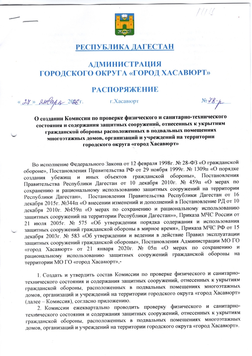 Распоряжение от 27 января 2026 г. № 78-р О создании Комиссии по проверке физического и санитарно-технического состояния и содержания защитных сооружений, отнесенных к укрытиям гражданской обороны расположенных в подвальных помещениях многоэтажных домов, организаций и учреждений на территории городского округа «город Хасавюрт»