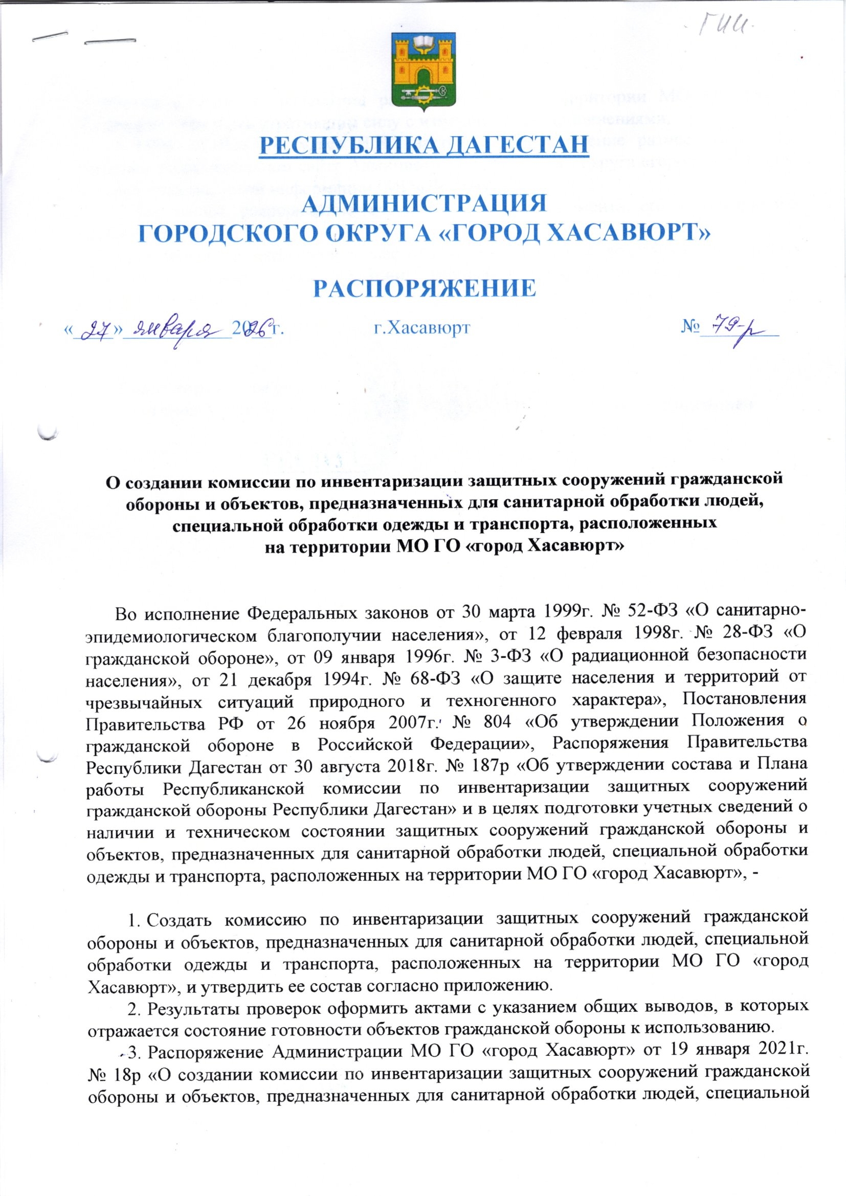 Распоряжение от 27 января 2026 г. № 79-р О создании комиссии по инвентаризации защитных сооружений гражданской обороны и объектов, предназначенных для санитарной обработки людей, специальной обработки одежды и транспорта, расположенных на территории МО ГО «город Хасавюрт»