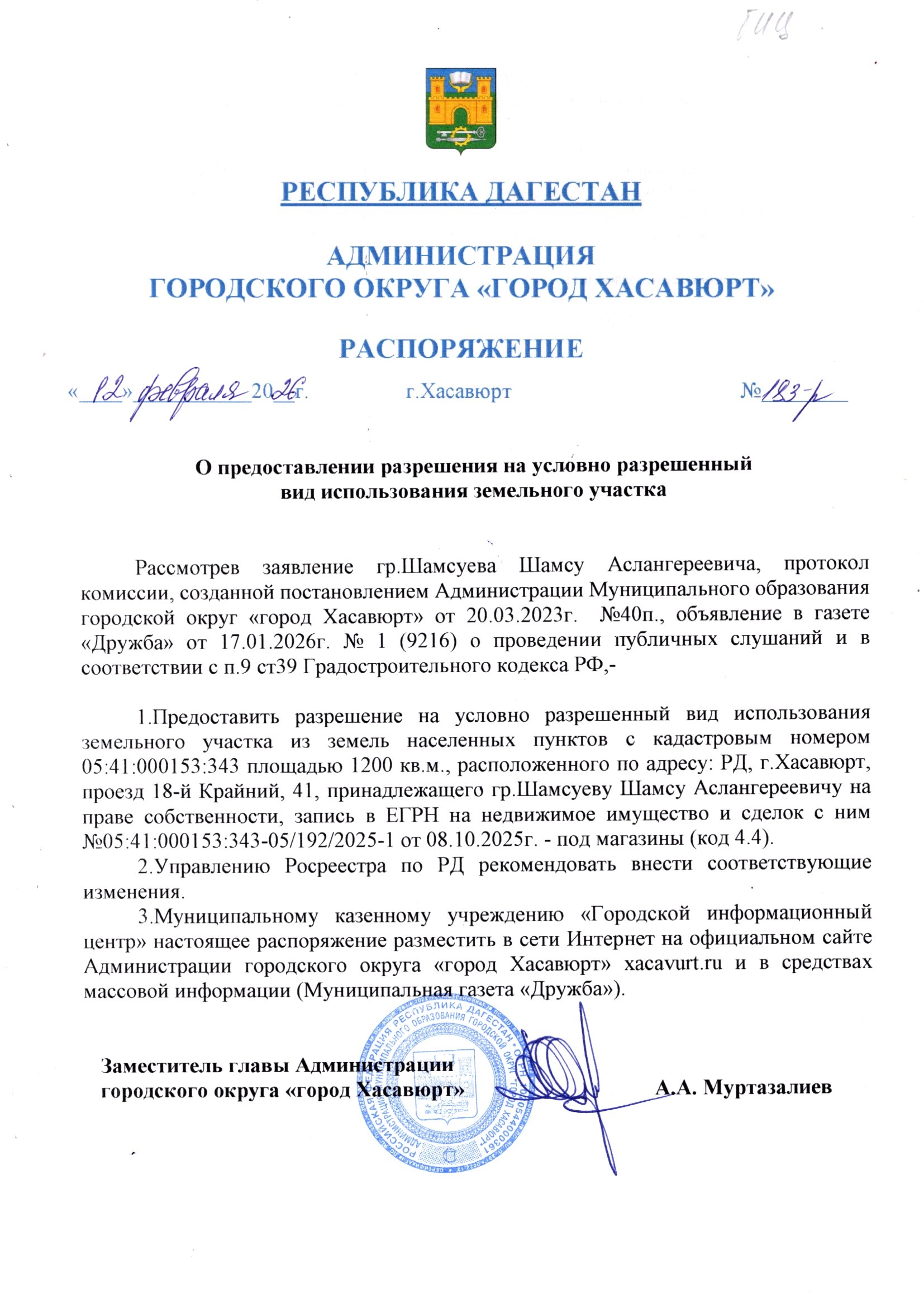 Распоряжение от 12 февраля 2026 г. № 183-р О предоставлении разрешения на условно разрешенный вид использования земельного участка