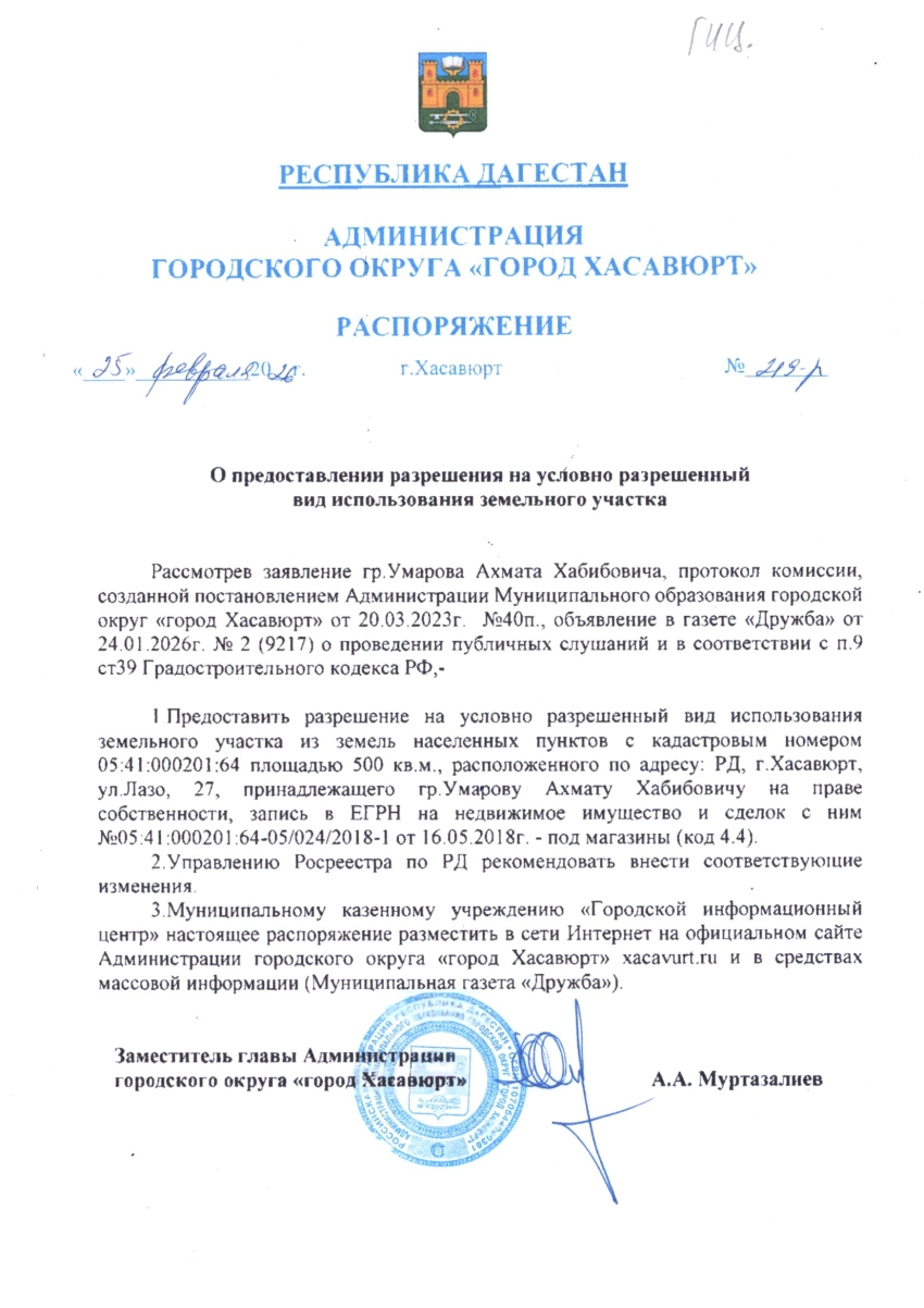 Распоряжение от 25 февраля 2026 г. № 219-р О предоставлении разрешения на условно разрешенный вид использования земельного участка