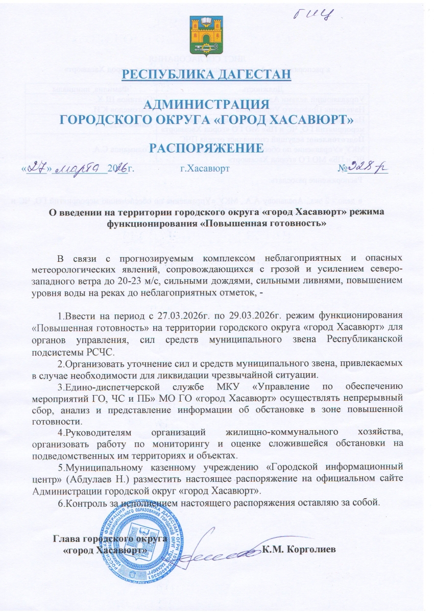 Распоряжене от 27 марта №328 О введении на территории городского округа "город Хасавюрт" режима функционирования "Повышенная готовность"