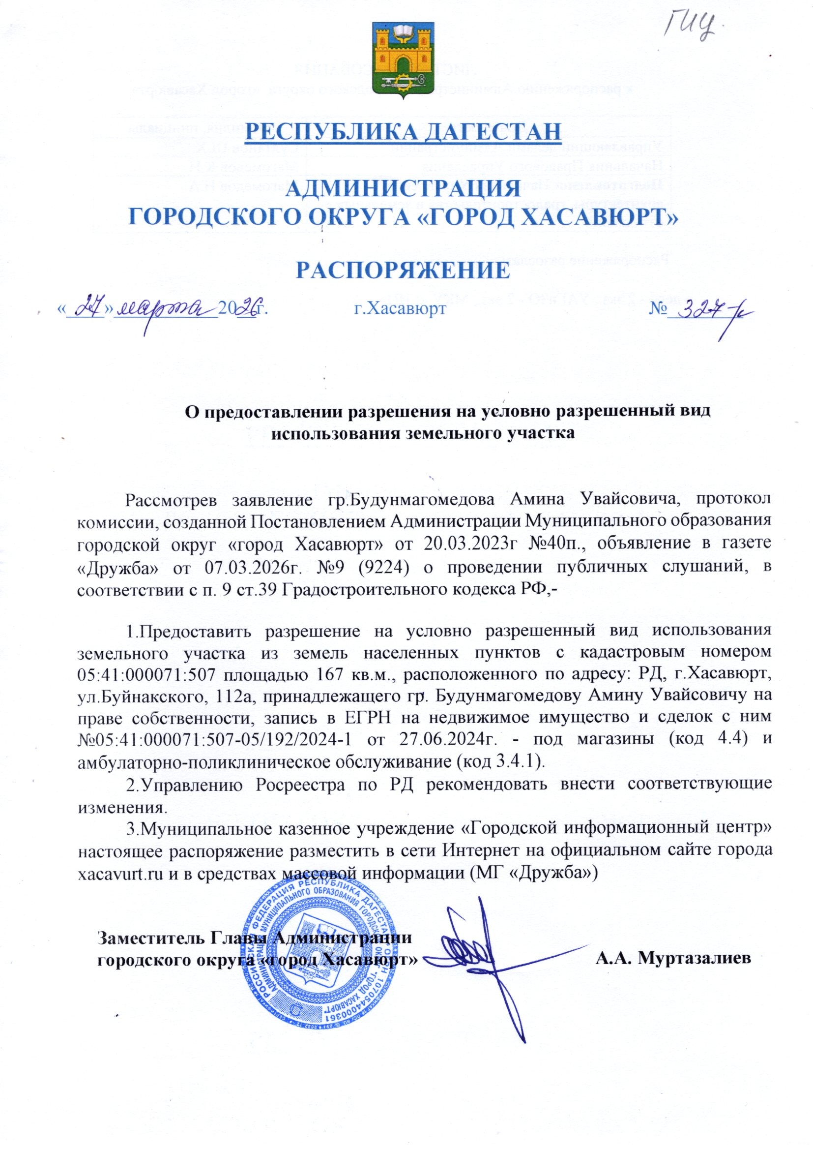 Распоряжение от 27 марта 2026г. № 327-р О предоставлении разрешения на условно разрешенный вид использования земельного участка