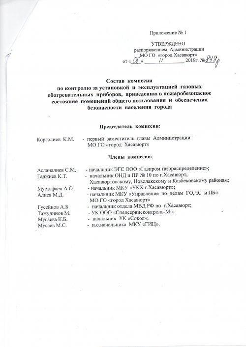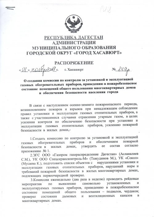 Распоряжение №849 от 08 ноября 2019 г. о создании комиссии по контролю за установкой и эксплуатацией газовых обогревательных приборов, приведению в пожаробезопасное состояние помещений общего пользования многоквартирных домов и обеспечения безопасности населения города.