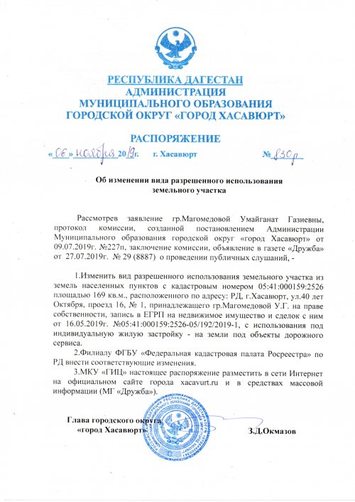Распоряжение №830р от 06 ноября 2019 г. об изменении вида разрешенного использования земельного участка