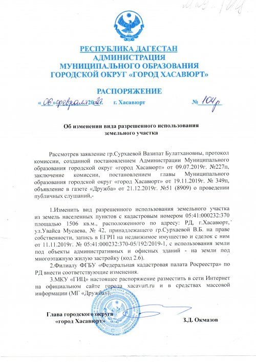 Распоряжение №104р от 06 февраля 2020 года об изменении вида разрешенного использования земельного участка