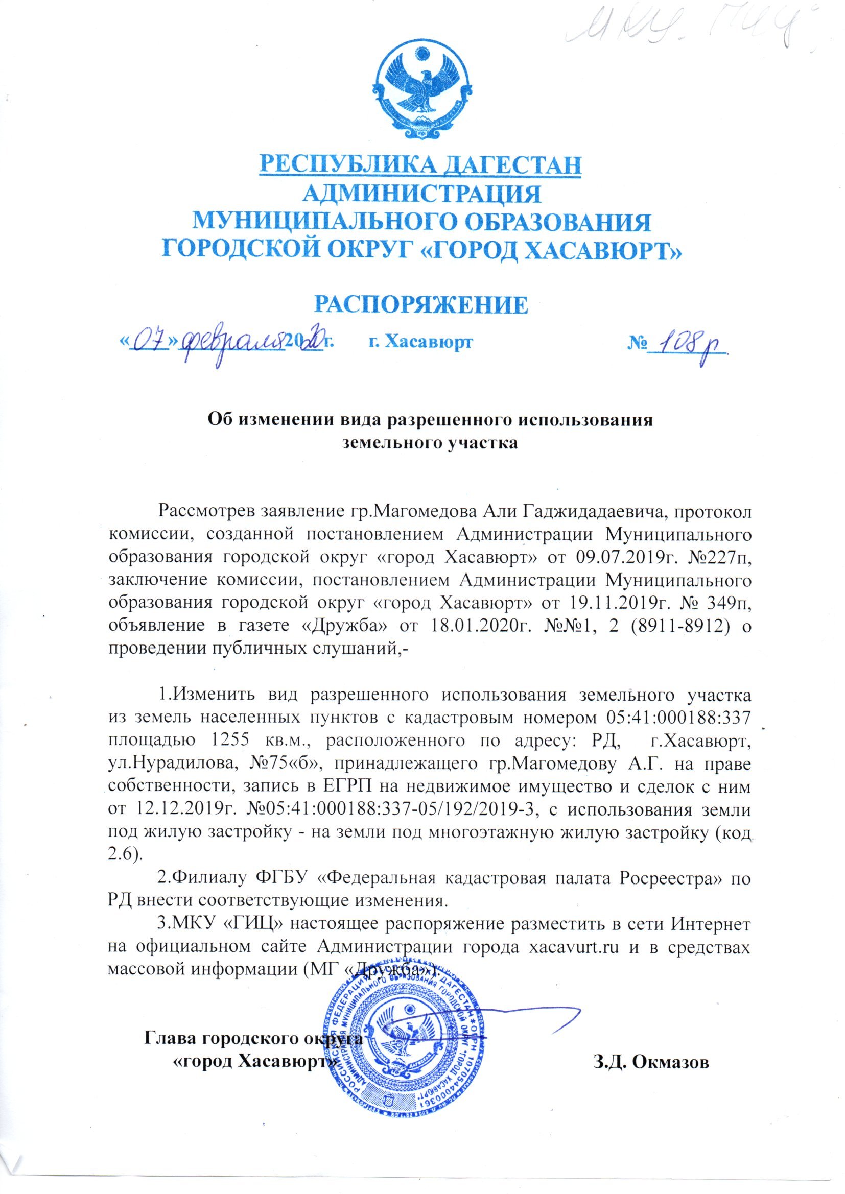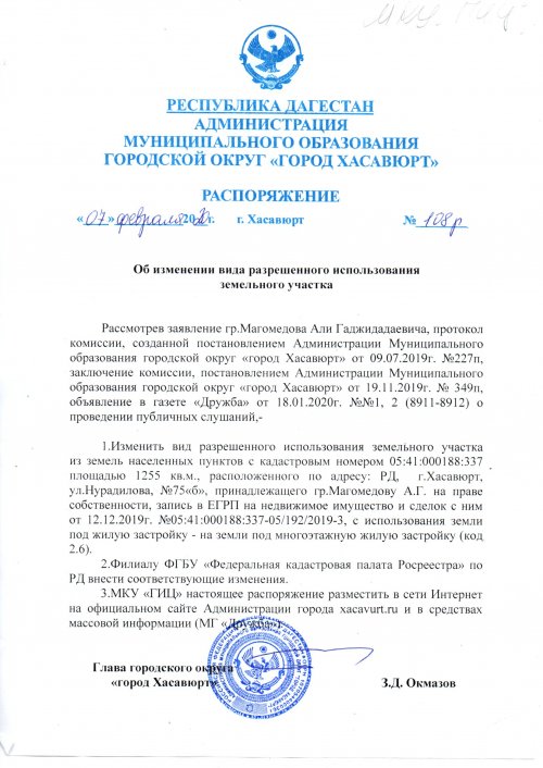 Распоряжение №108р от 07 февраля 2020 г. об изменении вида разрешенного использования земельного участка
