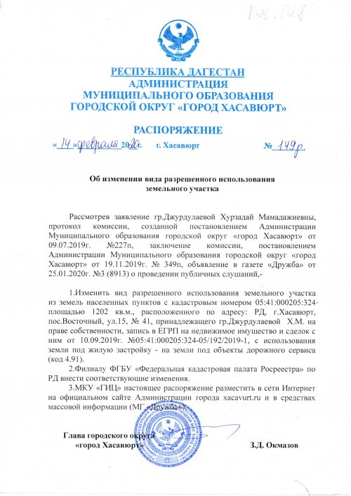 Распоряжение№149 от 14 февраля 2020 г. Об изменении вида разрешенного использования земельного участка