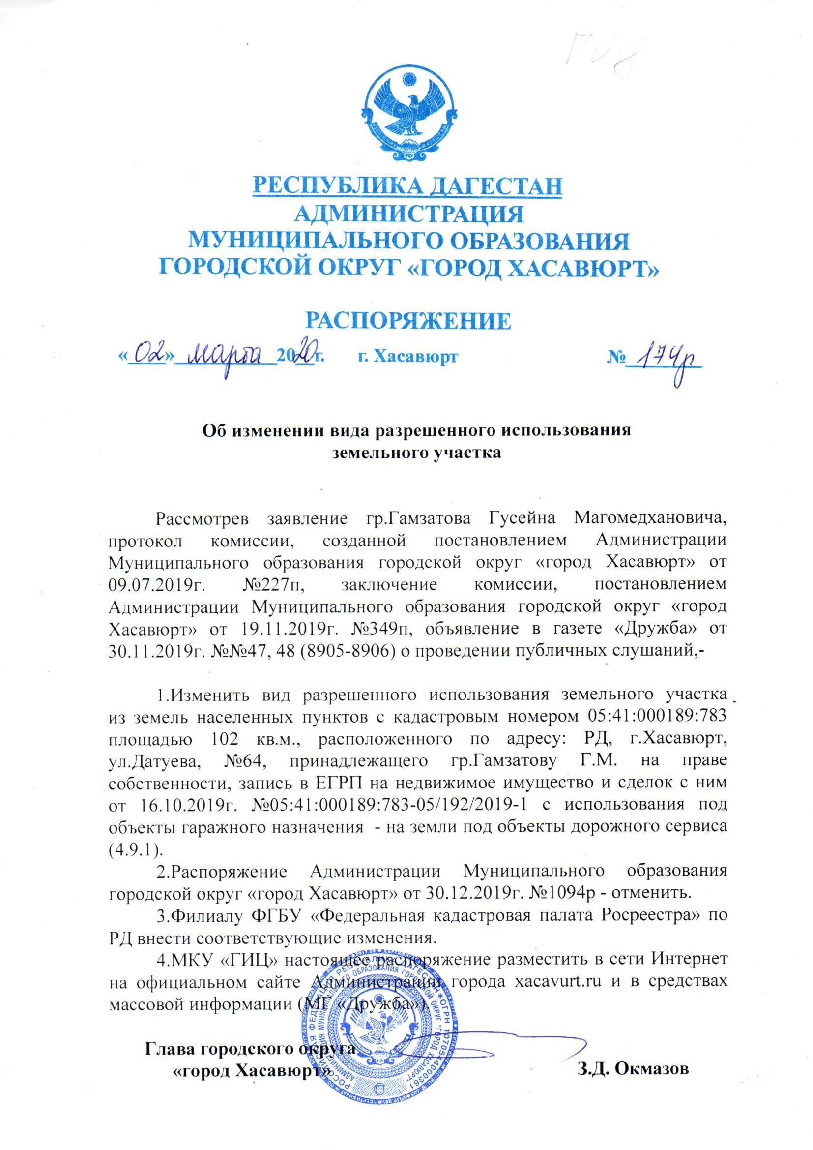 Распоряжение №174 от 02 марта 2020 г. об изменении вида разрешенного использования земельного участка