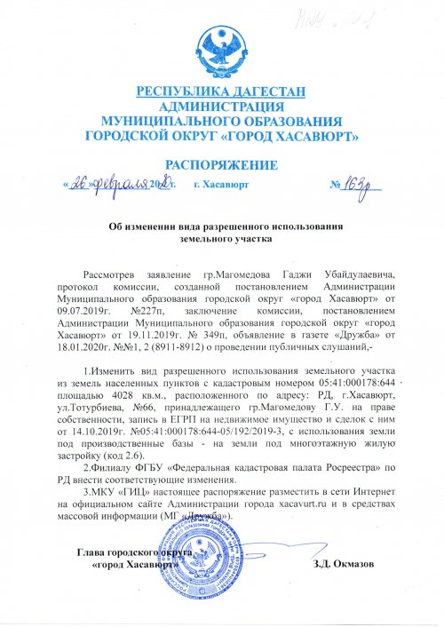 Распоряжение №163 от 26 февраля 2020 г. об изменение вида разрешенного использования земельного участка