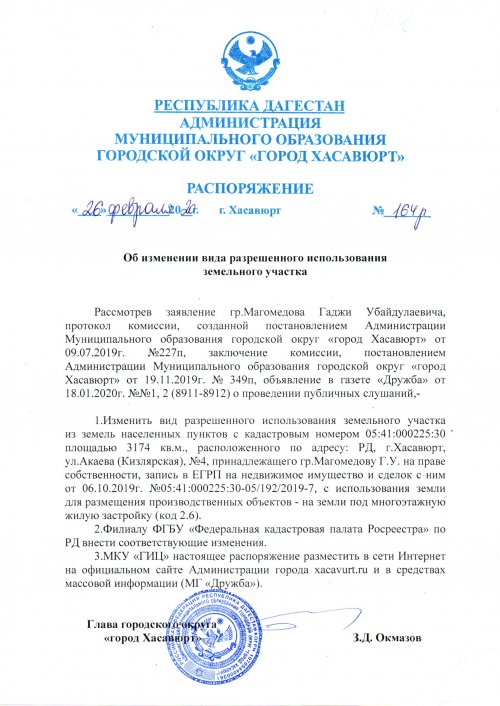 Распоряжение №164 от 26 февраля 2020 года об изменении вида разрешенного использования земельного участка