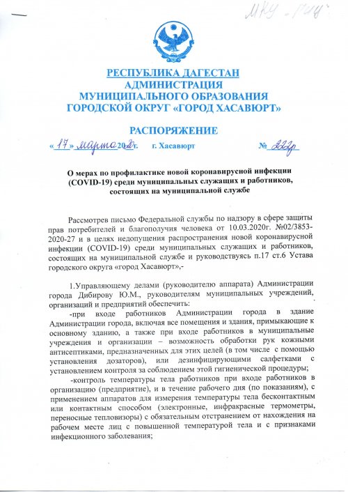 Распоряжение №222 от 17 марта 2020 года о мерах профилактике новой коронавирусной инфекции (COVID-19) среди муниципальных служащих и работников, состоящих на муниципальной службе