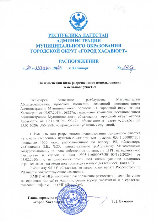 Распоряжение №266р от 24 марта 2020 г. об изменении вида разрешенного земельного участка