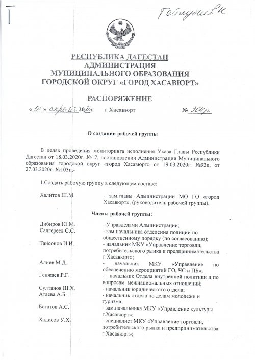 Распоряжение №304р от 01 апреля 2020 г. О создании рабочей группы