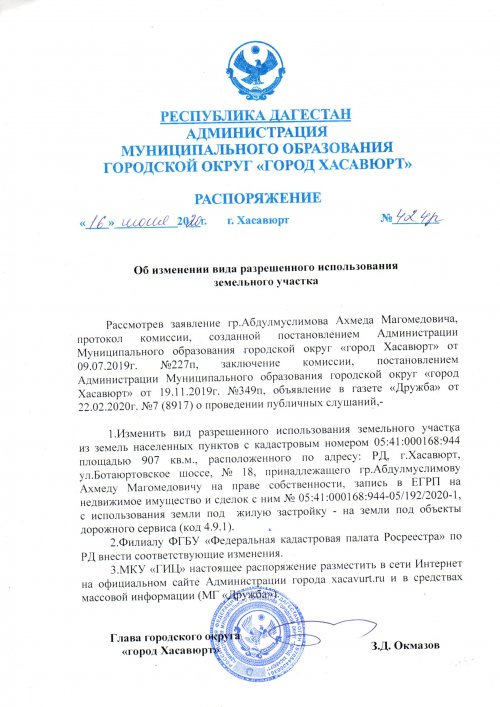 Распоряжение №424р от 16 июня 2020 г. Об изменении вида разрешенного использования земельного участка
