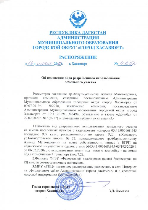 Распоряжение №425р от 16 июня 2020 года об изменении вида разрешенного использования земельного участка