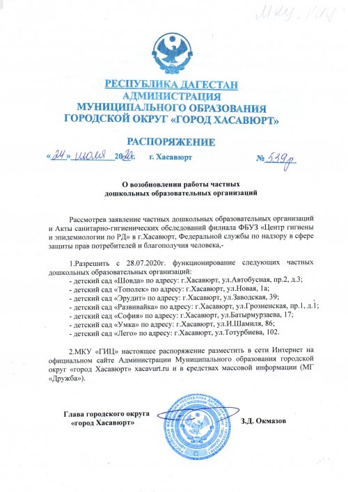 Распоряжение №539р от 24 июля 2020г. О возобновления работы частных дошкольных образовательных организаций