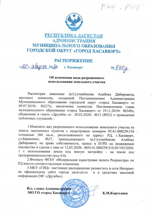 Распоряжение №640р от 20.08.2020 г. Об изменении вида разрешенного использования земельного участка