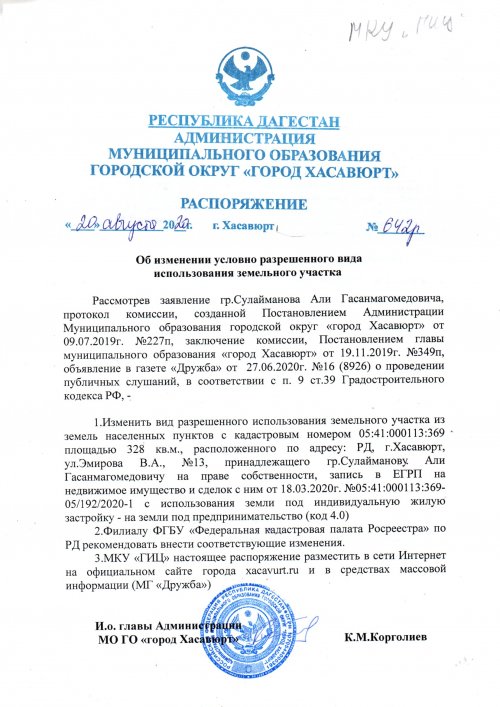Распоряжение №642р от 20.08.2020 г. Об изменении вида разрешенного использования земельного участка