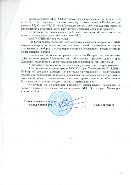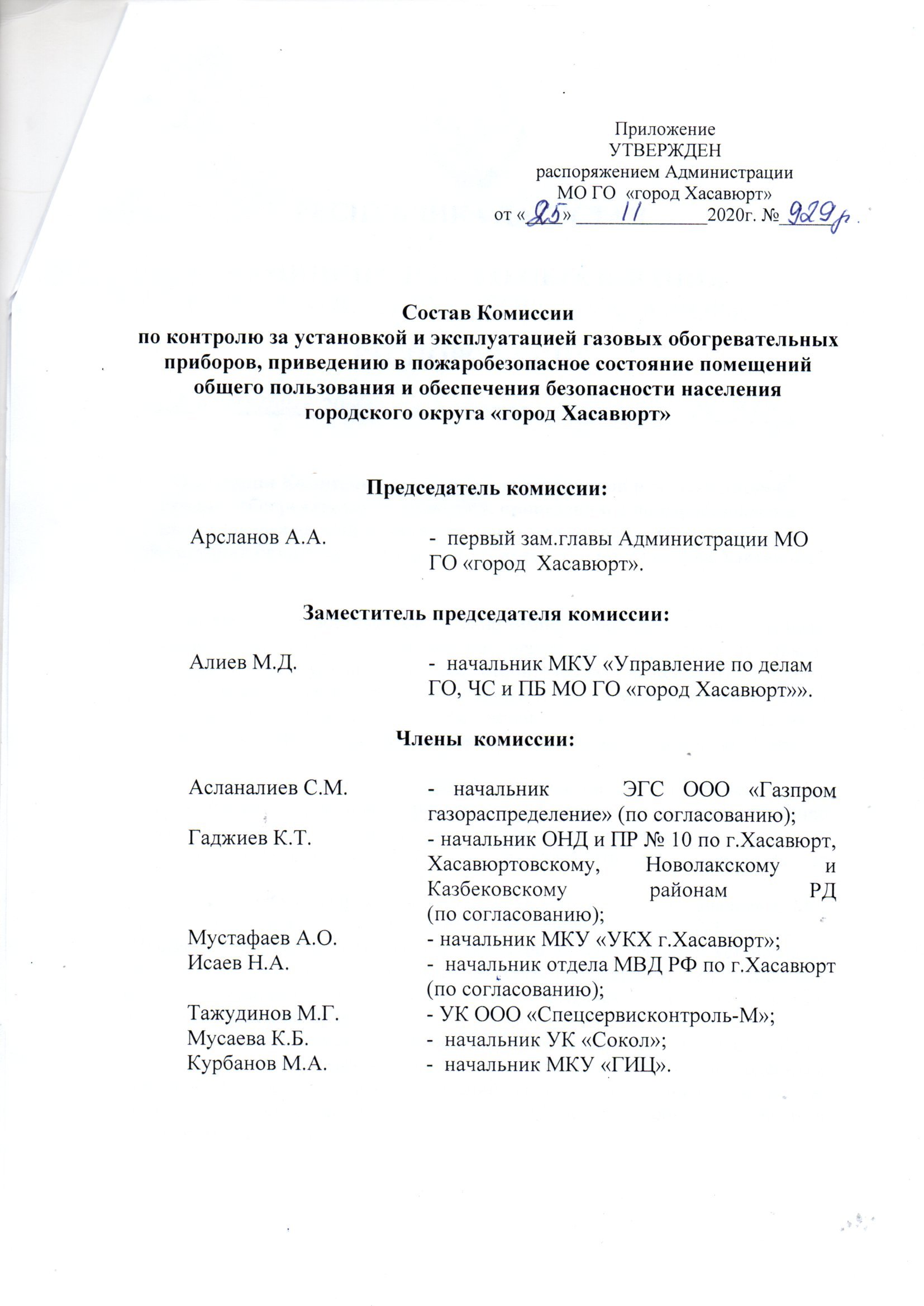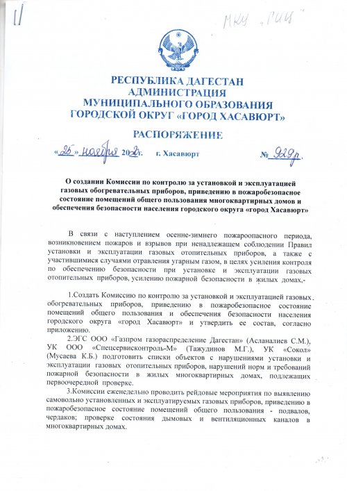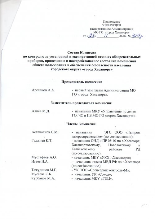 Распоряжение №929р от 25 ноября 2020 г. О создании Комиссии по контролю за установкой и эксплуатацией газовых обогреватеьных приборов, приведению в пожаробезопасное состояние помещений общего пользования многоквартирных домов и обеспечения безопасности населения городского округа "город Хасавюрт"