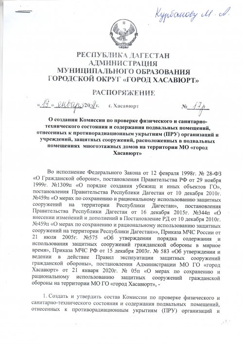 Распоряжение №17р от 19 января 2020 г. О создании Комиссии по проверке физического и санитарно-технического состояния и содержания подвальных помещений, отнесенных к противорадиационным укрытиям (ПРУ) организаций и учреждений, защитных сооружений, расположенных в подвальных помещениях многоэтажных домов на территории МО "город Хасавюрт"