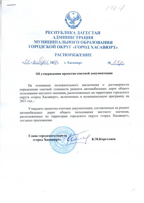 Распоряжение №29р от 26 января 2021 года Об утверждении проектно-сметной документации