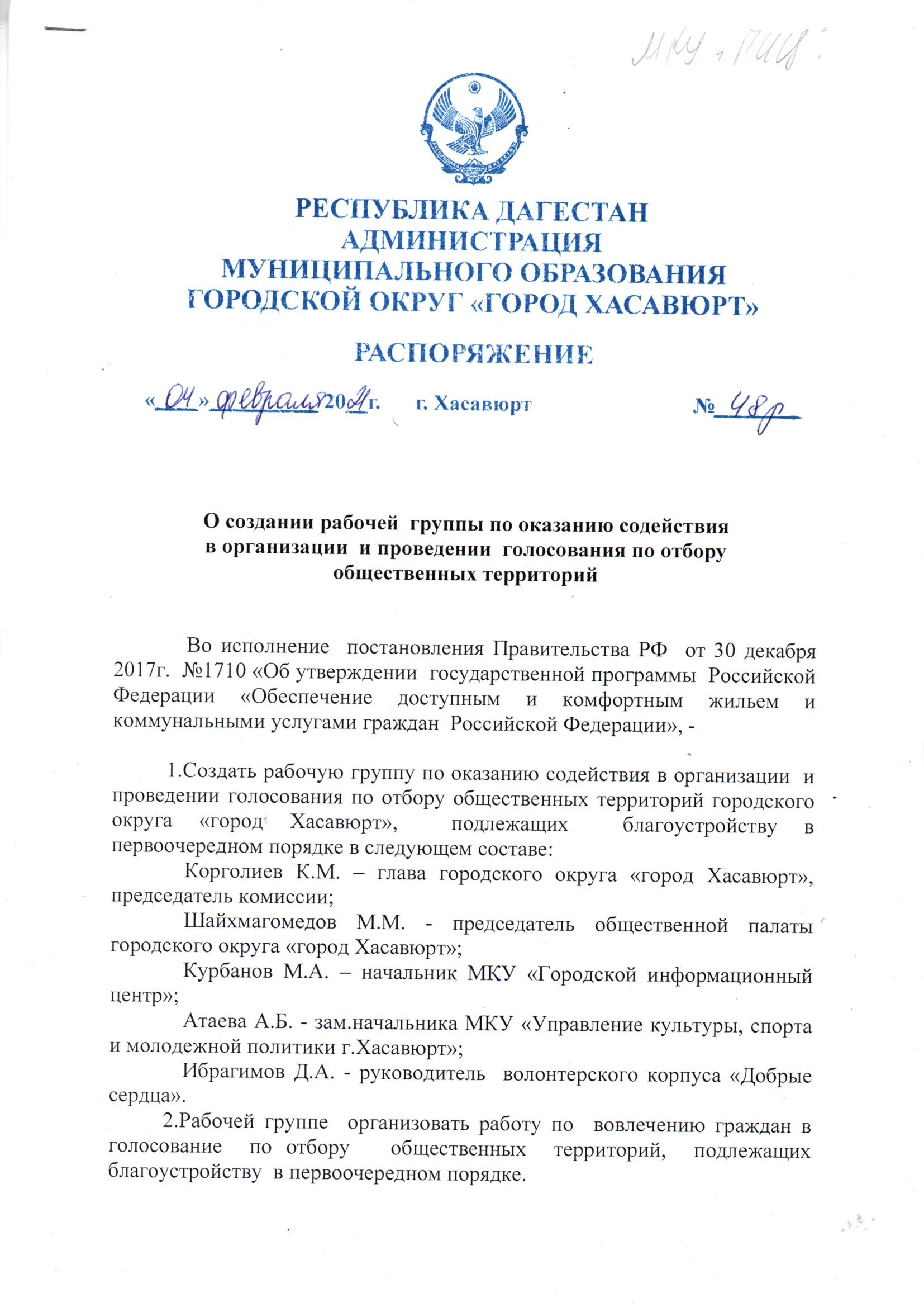Распоряжение №48 от 30 января 2019 года О проведении рейтингового голосования по проектам благоустройства общественных территорий в г. Хасавюрт в 2019 году