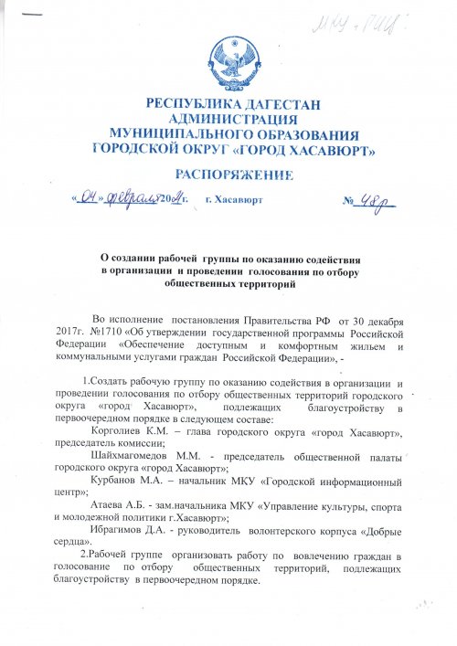 Распоряжение №48 от 04 февраля 2021 г. О создании рабочей группы по оказанию содействия в организации и проведении голосования по отбору общественных территорий