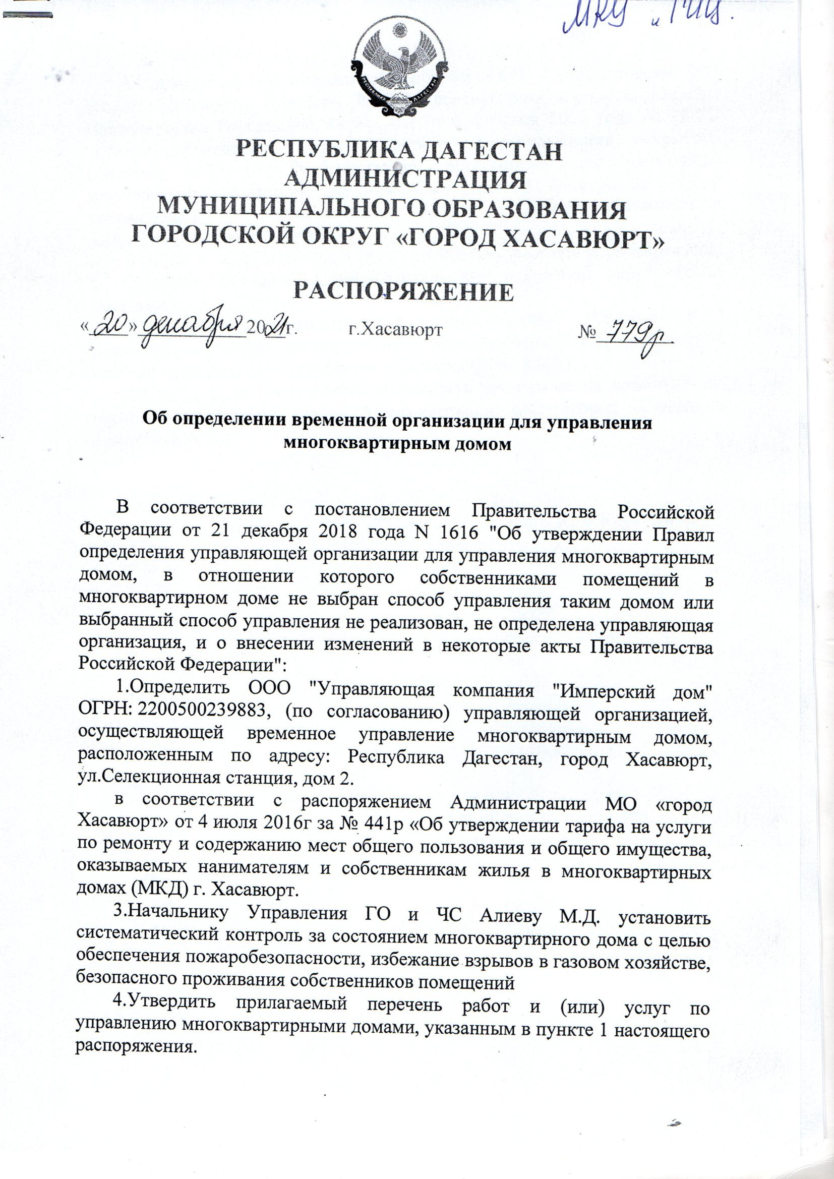 Распоряжение №779р от 20 декабря 2021г об определении временной организации для управления многоквартирным домом