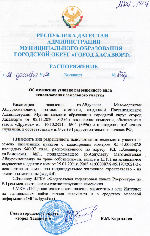 Распоряжение №800р от 28 декабря 2021г об изменении условно разрешённого вида использования земельного участка