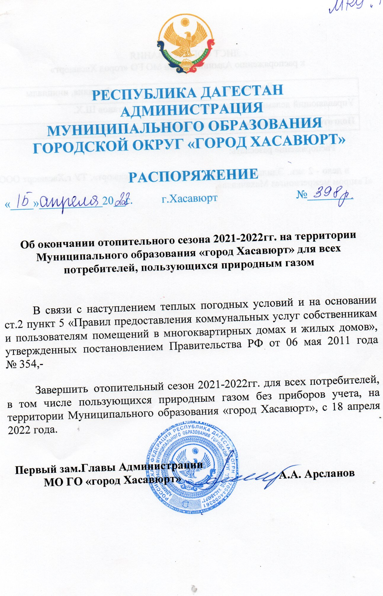 Распоряжение №398р от 15 апреля 2022 года об окончании сезона 2021-2022гг. на территории Муниципального образования "город Хасавюрт" для всех потребителей, пользующихся природным газом