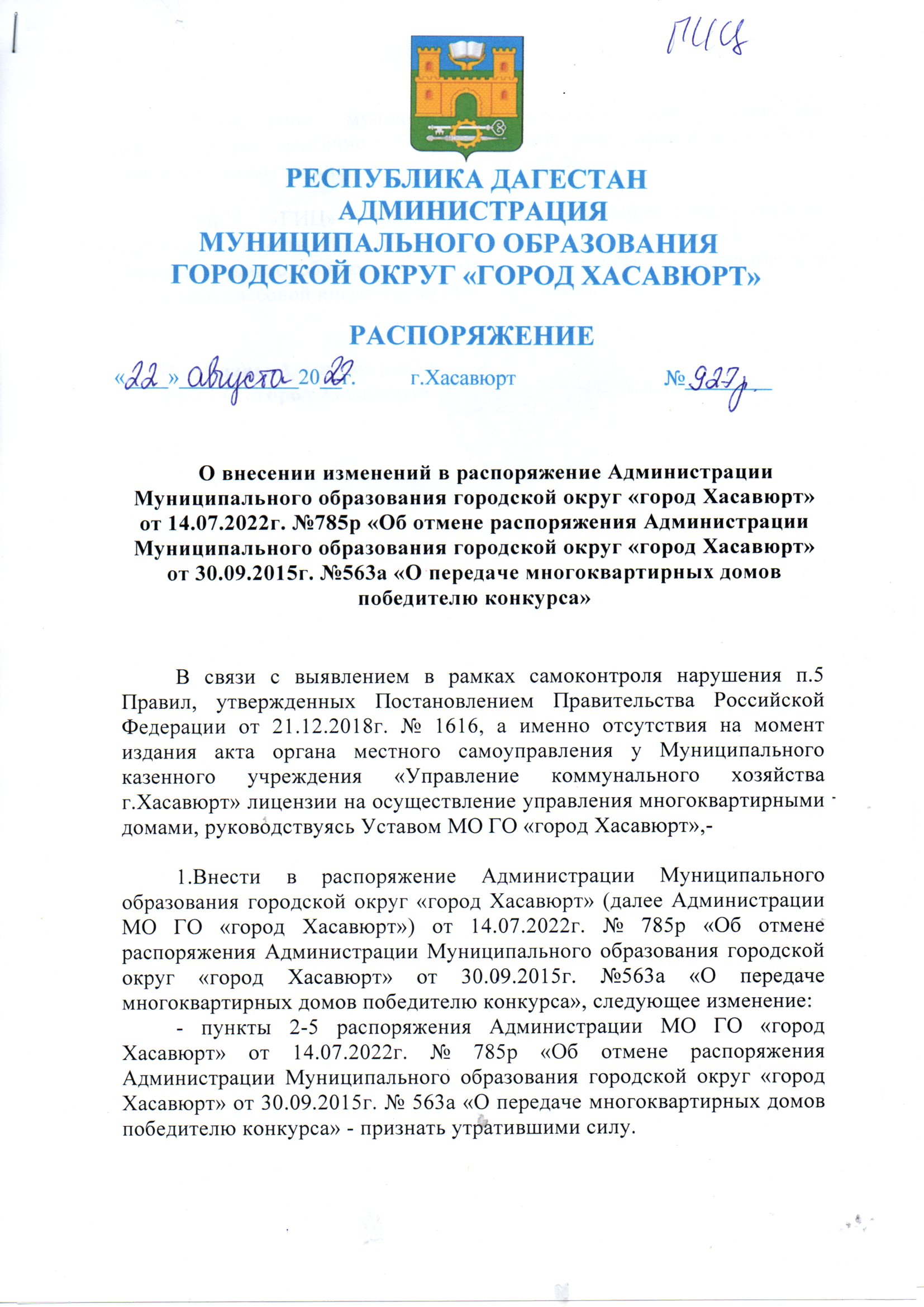 Распоряжение № 927р от 22 августа 2022 г. О внесении изменений в распоряжение Администрации Муниципального образования городской округ "город Хасавюрт" от 14.07.2022 г. № 785р "Об отмене распоряжения Администрации Муниципального образования городской округ "город Хасавюрт" от 30.09.2015 г. № 563а "О передачи многоквартирных домов победителю конкурса"