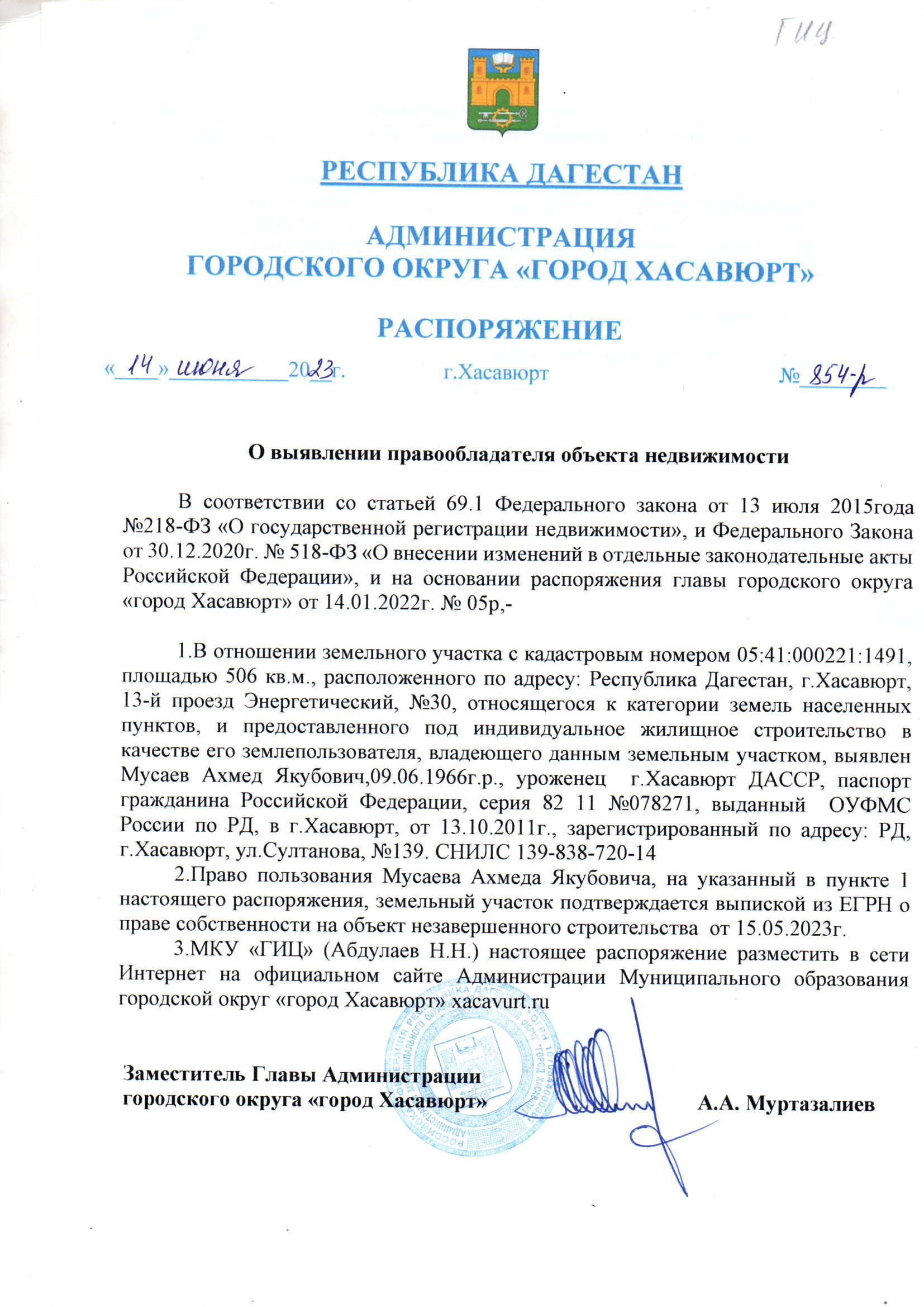 Распоряжение № 854-р от 14 июня 2023 г. О выявлении правообладателя объекта недвижимости