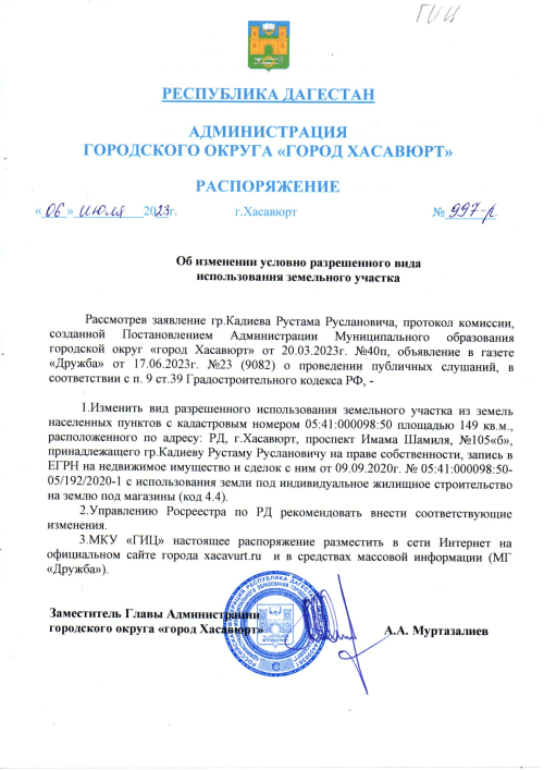 Распоряжение № 997-р от 06 июля 2023 г. Об изменении условно разрешенного вида использования земельного участка