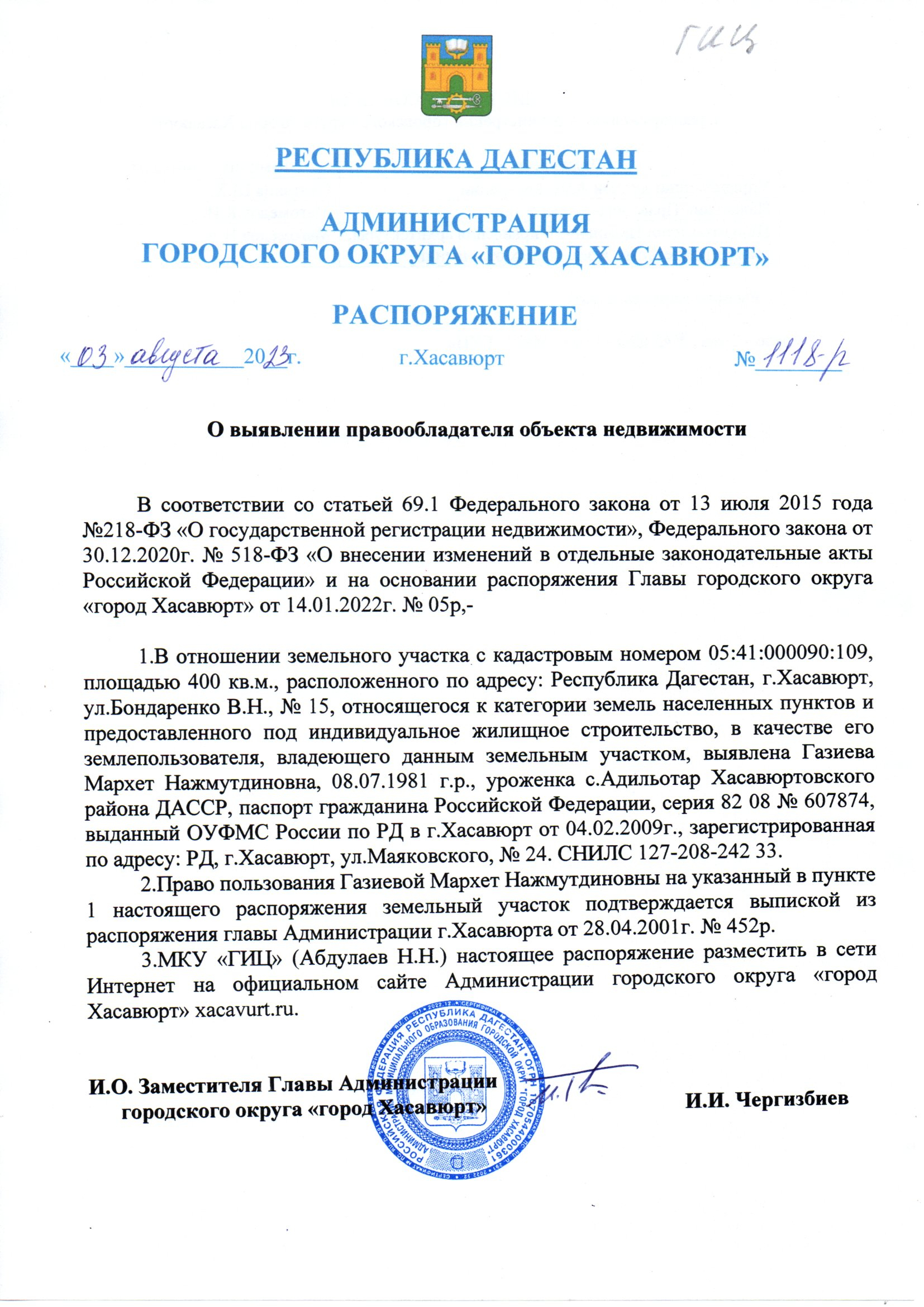 Распоряжение № 1118-р от 03 августа 2023 г. О выявлении правообладателя объекта недвижимости