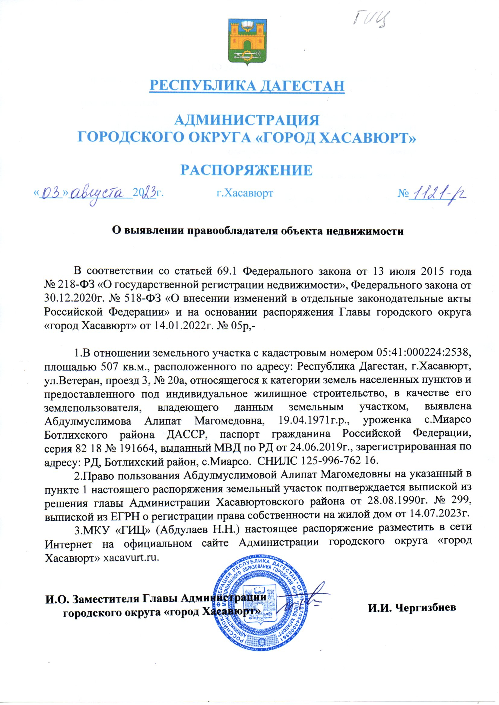 Распоряжение № 1125-р от 03 августа 2023 г. О выявлении правообладателя объекта недвижимости