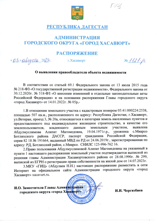 Распоряжение № 1121-р от 03 августа 2023 г. О выявлении правообладателя объекта недвижимости